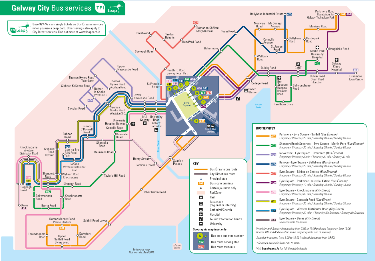 Tabhair faoi Deara: Ó 1ú Nollaig 2017, clúdaíonn crios Dearg na Gaillimhe Órán Mór (Bealach 404 amháin) agus Bearna (Bealach 424).