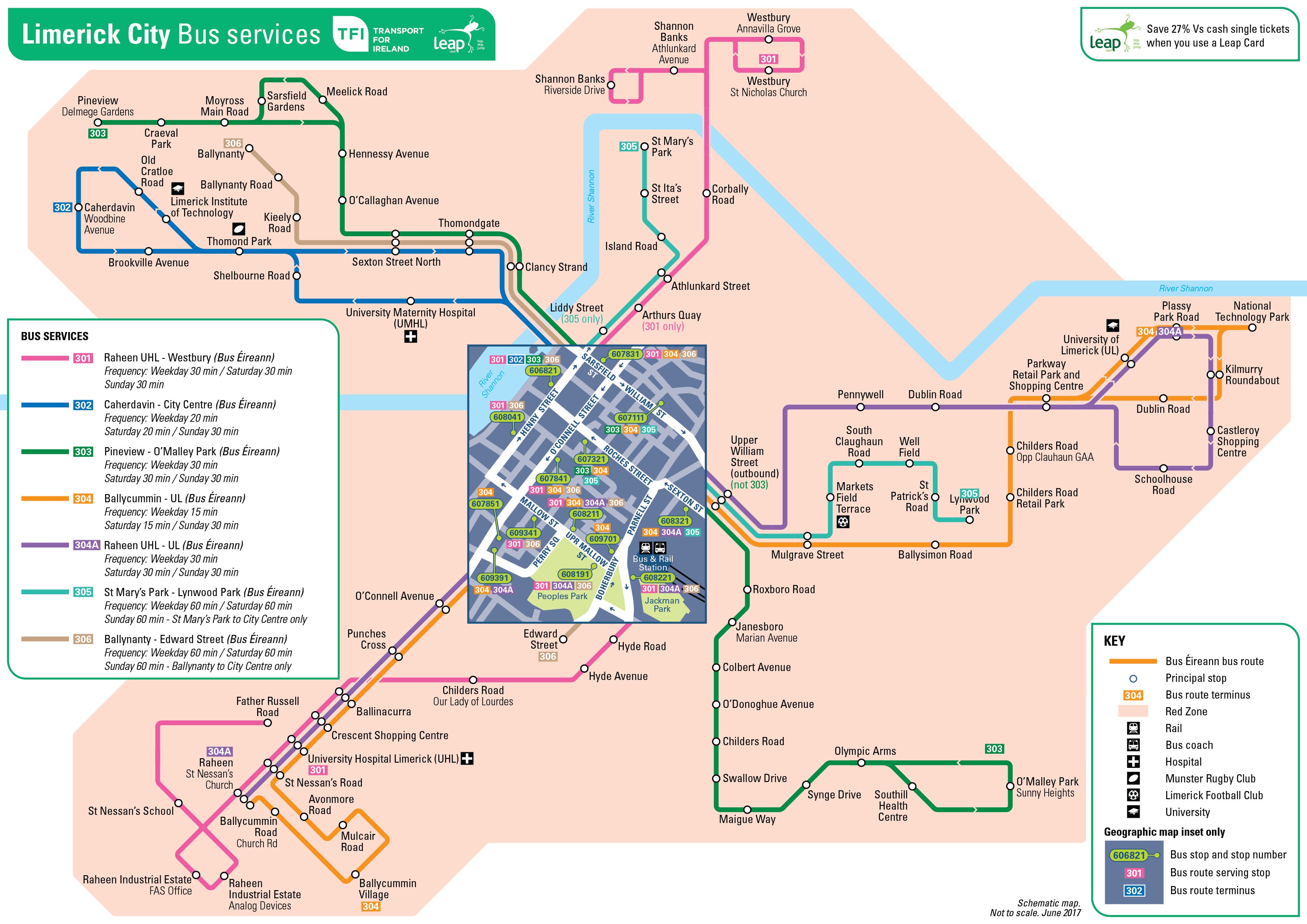 Tá ticéid bhliantúil ó Chrios Dearg Luimnigh bailí ar sheirbhísí bus uile Chathair Luimnigh agus ón 1 Nollaig 2017 ar Áth an Choite, Ard na Croise, Baile Uí Chanann, Crosaire na hAbhann Duibhe, Crosaire Bun Caoith, Caisleán Uí Chonaill, Croisaire an tSéipéil, Cluain Lára, Crosaire Chonchúir, An Corrbhaile, Crosaire Uí Lorcáin, An Pairtín, Crosaire Rohan agus Crosaire Theach na Foraire ar bhealaí 313, 323, 332 341 & 345. Rialacháin agus bailíocht.